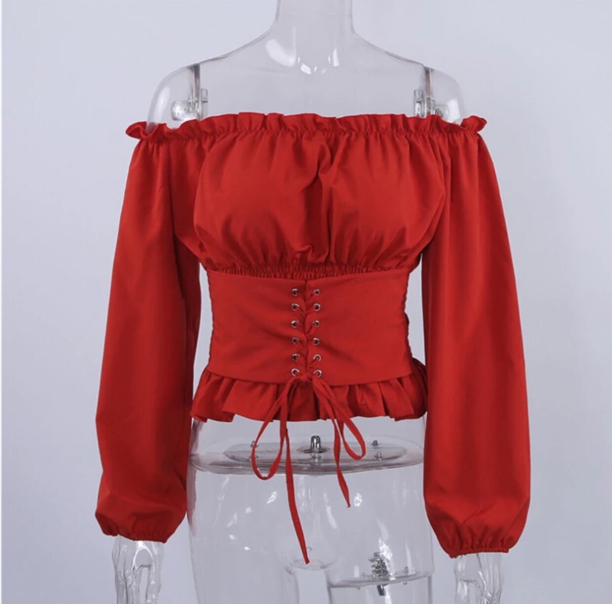 大人気のオフショルに袖はランタンスリーブになっていてウエストはコルセットタイプになってるのですっきり見せてくれてスタイルアップ♪