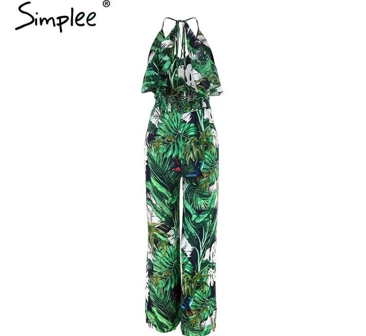 背中が大胆に空いた胸元フリルモンステラ柄オールインワン♪