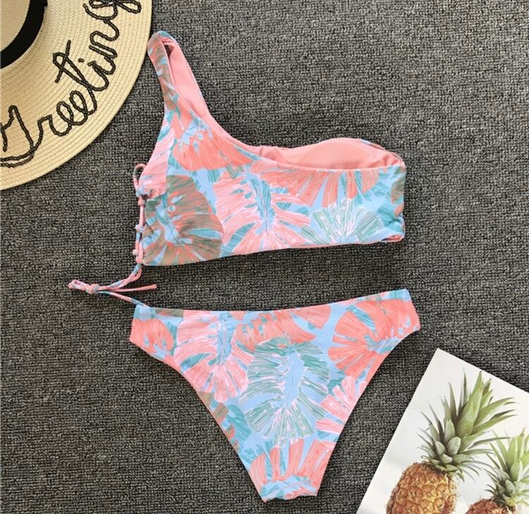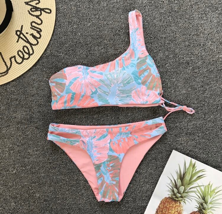 サイド編み上げボタニカル柄ワンショルダービキニ♪