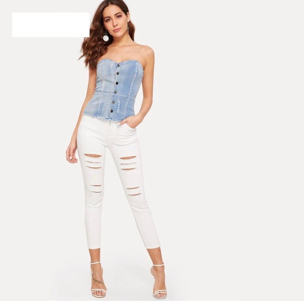 胸元、ウエストラインが綺麗に見えるように計算されたデザインのボタンデニムベアトップ♪