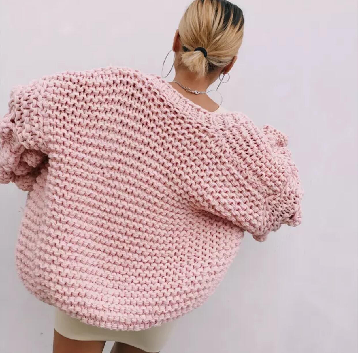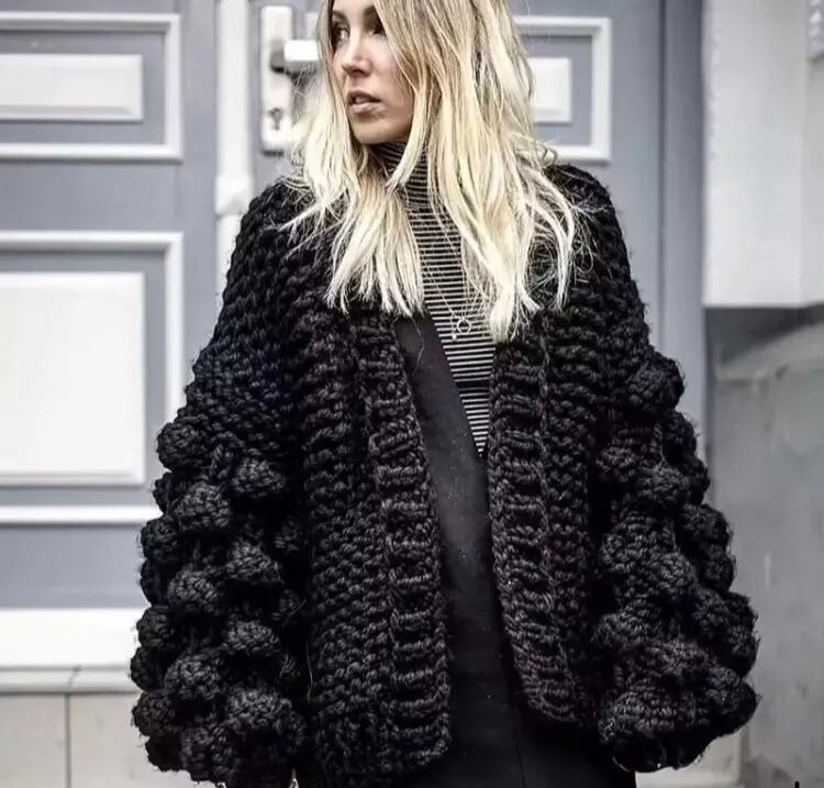 ボリュームたっぷりざっくり鍵編みにニットに袖のボリューム感と袖元のポンポンデザインがとっても可愛いカーディガン♪